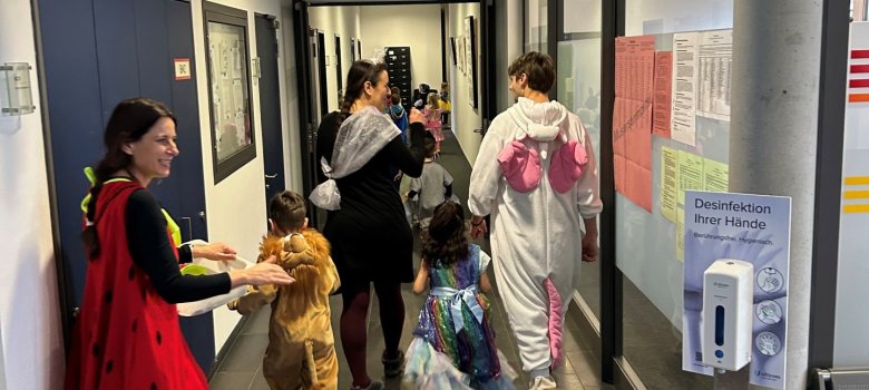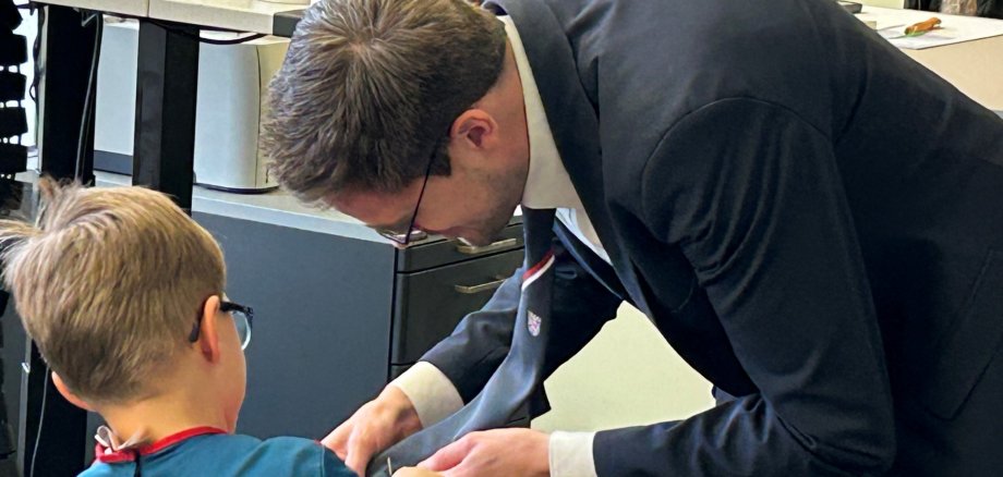 Schnipp, schnapp: Bürgermeister Sinß hat seine Krawatte an die Kinder der Kita Kunterbunt verloren