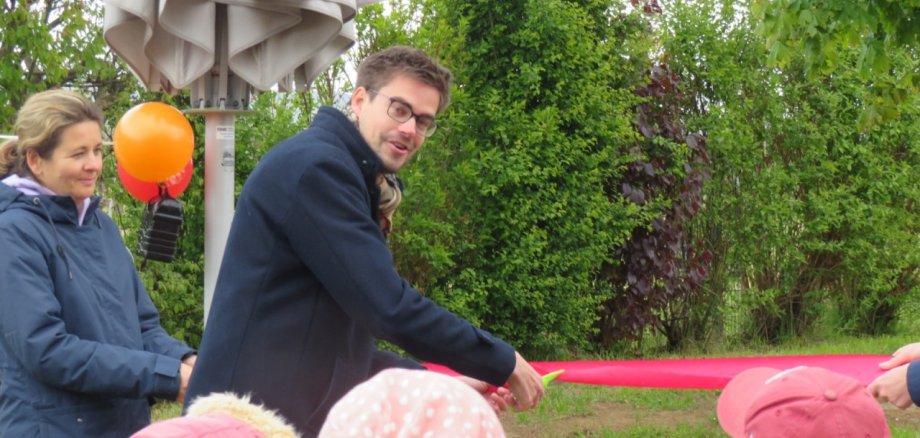 Zur Einweihungsparty kam Bürgermeister Carsten Sinß, um feierlich ein Band durchzuschneiden und das Spielgerät offiziell zum Spielen für die Kinder freizugeben: „Ich bedanke mich bei den beteiligten Baufirmen sowie den Mitarbeitern des Baubetriebshofs Oestrich-Winkel, die das Gelände fachgerecht vorbereitet, den Erdaushub und die anschließende Sandfüllung vorgenommen und das schöne neue Klettergerüst fachgerecht verankert und aufgebaut haben. Damit hat unsere städtische Kita ‚Purzelbaum‘ wieder ein attraktives Außengelände und die Kinder haben die Möglichkeit zum Klettern und toben“. Die Kinder selbst hatten zu diesem Anlass Muffins und Obstkuchen gebacken, den Kinder, Mitarbeiter/innen und Eltern gemeinsam genießen konnten.