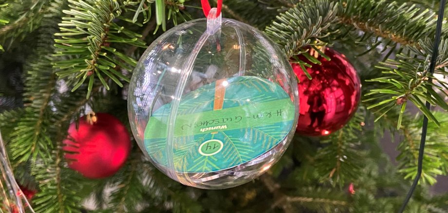 Die Mitarbeiterinnen der Jugendarbeit Stadt Oestrich-Winkel nehmen die Wünsche auf und notieren sie auf ein Blatt Papier, das in eine Weihnachtskugel mit Schraubverschluss gelegt wird. Danach schmücken diese mit Wünschen ausgestatteten Weihnachtskugeln den großen Christbaum im Bürgerzentrum der Stadt Oestrich-Winkel.