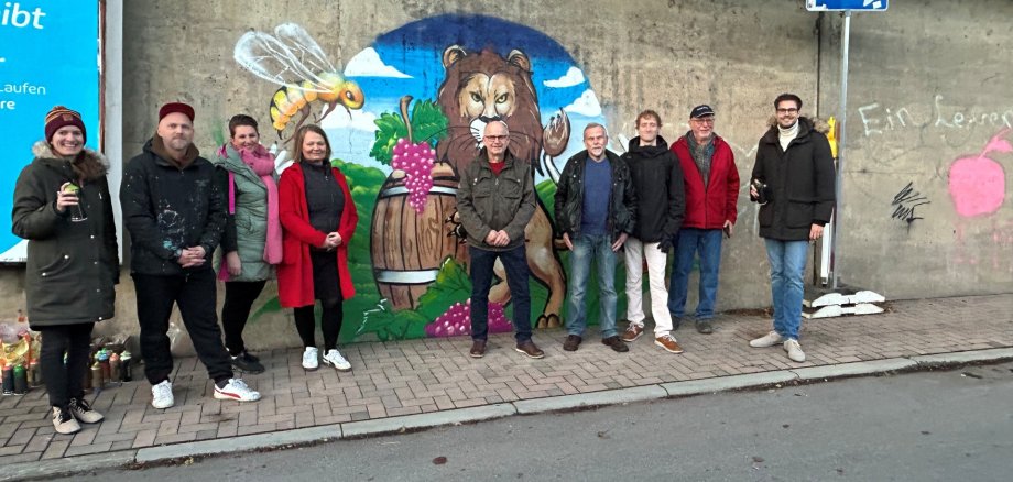 Die Idee dazu war im Ortsbeirat Mittelheim entstanden. Der bekannte Graffitikünstler Arkadiusz Grajek hat als erster mit der künstlerischen Gestaltung der Wand begonnen. Sein tierisch-gutes Gemälde lädt Sprayer und solche, die es werden wollen, dazu ein, daran anzuknüpfen!
