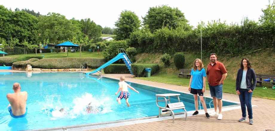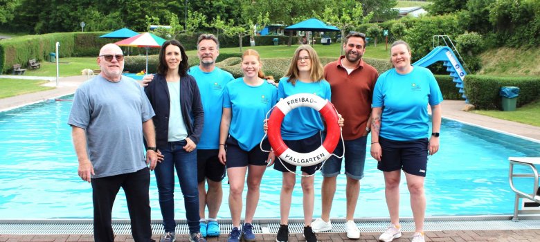 Das Freibad-Team von links nach rechts: Klaus Reinhardt (Betriebsleitung), Rebecca Craes (Ortsvorsteherin von Hallgarten), Frank Fenten (Rettungsschwimmer), Lea Reinhardt (Rettungsschwimmerin), Victoria Frey (Meisterin für Bäderbetriebe), Erster Stadtrat Björn Sommer, Jessica Tomaszewski (Rettungsschwimmerin)
