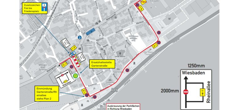 Eine Umleitung des motorisierten Verkehrs aus Rüdesheim kommend und in Richtung Wiesbaden fahrend über die Gartenstraße, die Rheinallee und die Europaallee wird eingerichtet. Diese Umleitung fahren auch die Linienbusse der Linie 171 mit Ziel Wiesbaden. Daher entfällt die Haltestelle „Friedensplatz“ in Fahrtrichtung Wiesbaden. Eine Ersatzhaltestelle wird in der Gartenstraße eingerichtet auf Höhe der Einmündung „Am Rosengarten“.