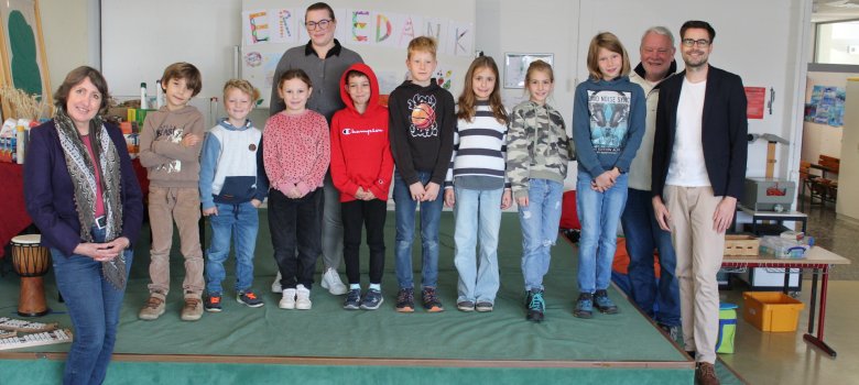 Von links nach rechts: Sabine Prillwitz, Schulleiterin der Grundschule Hallgarten, die Klassensprecherinnen und Klassensprecher der Grundschule Hallgarten, Larissa Kremer, Leiterin der Tafel Rheingau (Mitte), Stephan Henrich, ehrenamtlicher Mitarbeiter der Tafel Rheingau, Bürgermeister Carsten Sinß