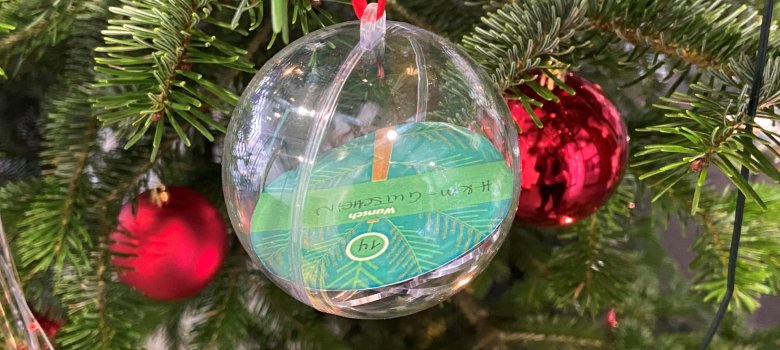 Die Mitarbeiterinnen der Jugendarbeit Stadt Oestrich-Winkel nehmen die Wünsche auf und notieren sie auf ein Blatt Papier, das in eine Weihnachtskugel mit Schraubverschluss gelegt wird. Danach schmücken diese mit Wünschen ausgestatteten Weihnachtskugeln den großen Christbaum im Bürgerzentrum der Stadt Oestrich-Winkel.