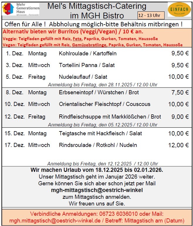 In der Zeit vom 18.12.2025 – 02.01. 2026 legt das Mehrgenerationenhaus Oestrich-Winkel eine Winterferienpause ein und ist für alle Kurse und Angebote geschlossen. Allen Nutzern, Besuchern und Freunden des Mehrgenerationenhauses frohe Feiertage und einen guten Rutsch ins Neue Jahr und hoffentlich wieder viele fröhliche, gesunde, persönliche Begegnungen im Neuen Jahr. Bleiben Sie gesund.