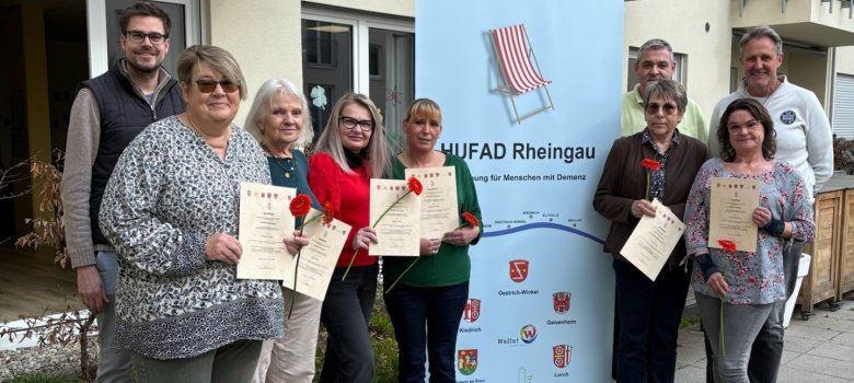 Die HUFAD Rheingau freut sich über acht neue ehrenamtliche Betreuerinnen und Betreuer für Menschen mit Demenzerkrankung. Bürgermeister Carsten Sinß überreichte am Samstag, 21. März 2026, die Zertifikate nach erfolgreichem Abschluss der Qualifizierung.
