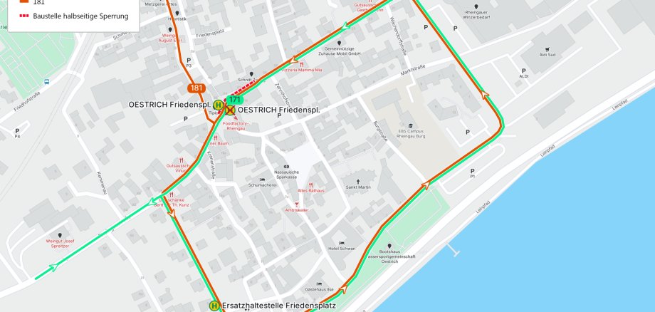 Eine Umleitung des motorisierten Verkehrs aus Rüdesheim kommend und in Richtung Wiesbaden fahrend über die Gartenstraße, die Rheinallee und die Europaallee wird eingerichtet. Diese Umleitung fahren auch die Linienbusse der Linie 171 mit Ziel Wiesbaden. Daher entfällt die Haltestelle „Friedensplatz“ in Fahrtrichtung Wiesbaden. Eine Ersatzhaltestelle wird in der Gartenstraße eingerichtet auf Höhe der Einmündung „Am Rosengarten“.